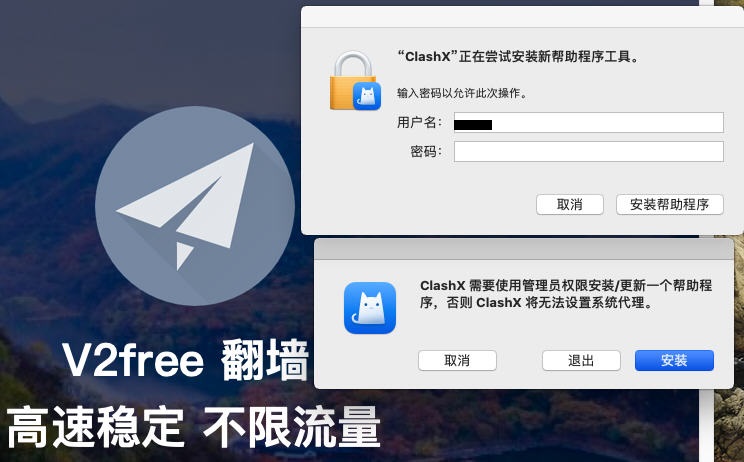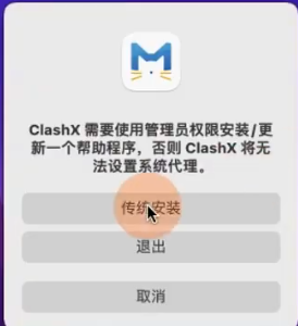 第一次启动ClashX时,依次点击:打开、安装、输入密码,点击“安装帮助程序”,即可启动ClashX了(如下图)。
