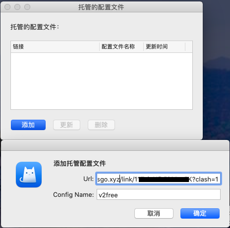 然后点击 添加 ,粘贴上方 获取订阅 中的拷贝的订阅链接(注意,粘贴后如果看不到url,可能是因为多了一个空行,按一次“Backspace删除键”即可)。